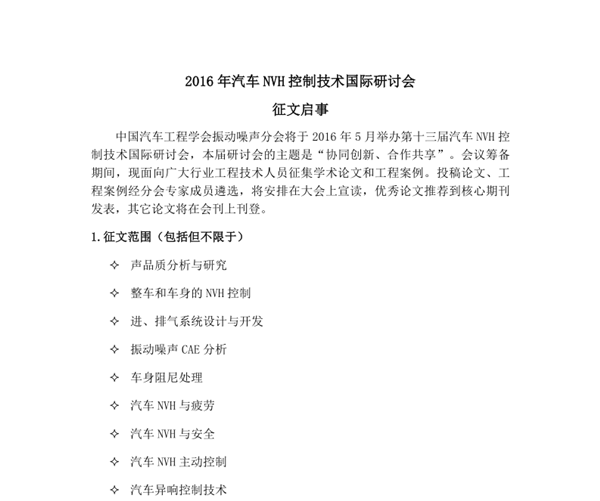2016年汽車(chē)NVH控制技術(shù)國(guó)際研討會(huì)征文啟事