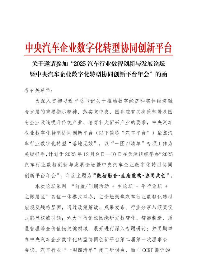“2025汽車行業(yè)數(shù)智創(chuàng)新與發(fā)展論壇暨中央汽車企業(yè)數(shù)字化轉(zhuǎn)型協(xié)同創(chuàng)新平臺(tái)年會(huì)” 會(huì)議通知